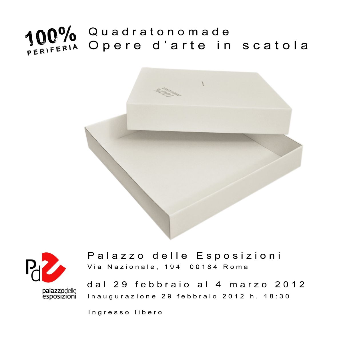 Quadratonomade è un progetto che prevede la costituzione di una esposizione itinerante di circa duecento opere d´arte in scatole di cartone all´interno delle quali artisti attivi nel panorama contemporaneo nazionale e internazionale hanno realizzato il proprio intervento creativo. Le scatole d´artista saranno esposte il 29 febbraio 2012 al Palazzo delle Esposizioni e viaggeranno nei prossimi tre anni raggiungendo diversi luoghi in Italia e all´estero.